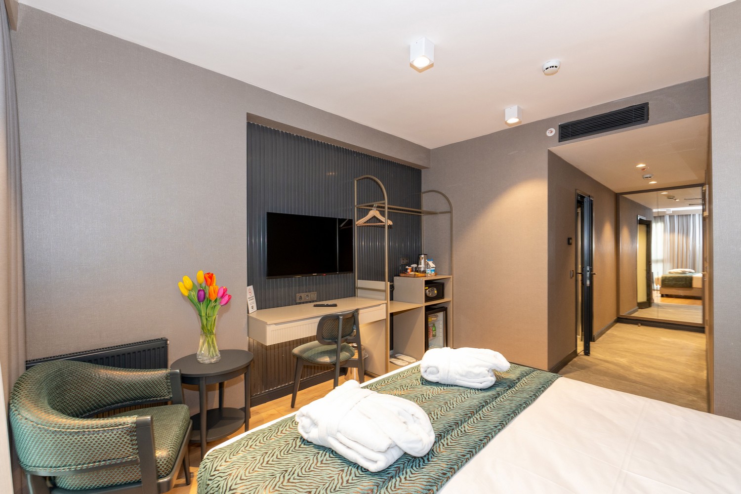 The comfortable and spacious room has a large screen android TV. In addition to the tea/coffee set, there are free toiletries in the room.